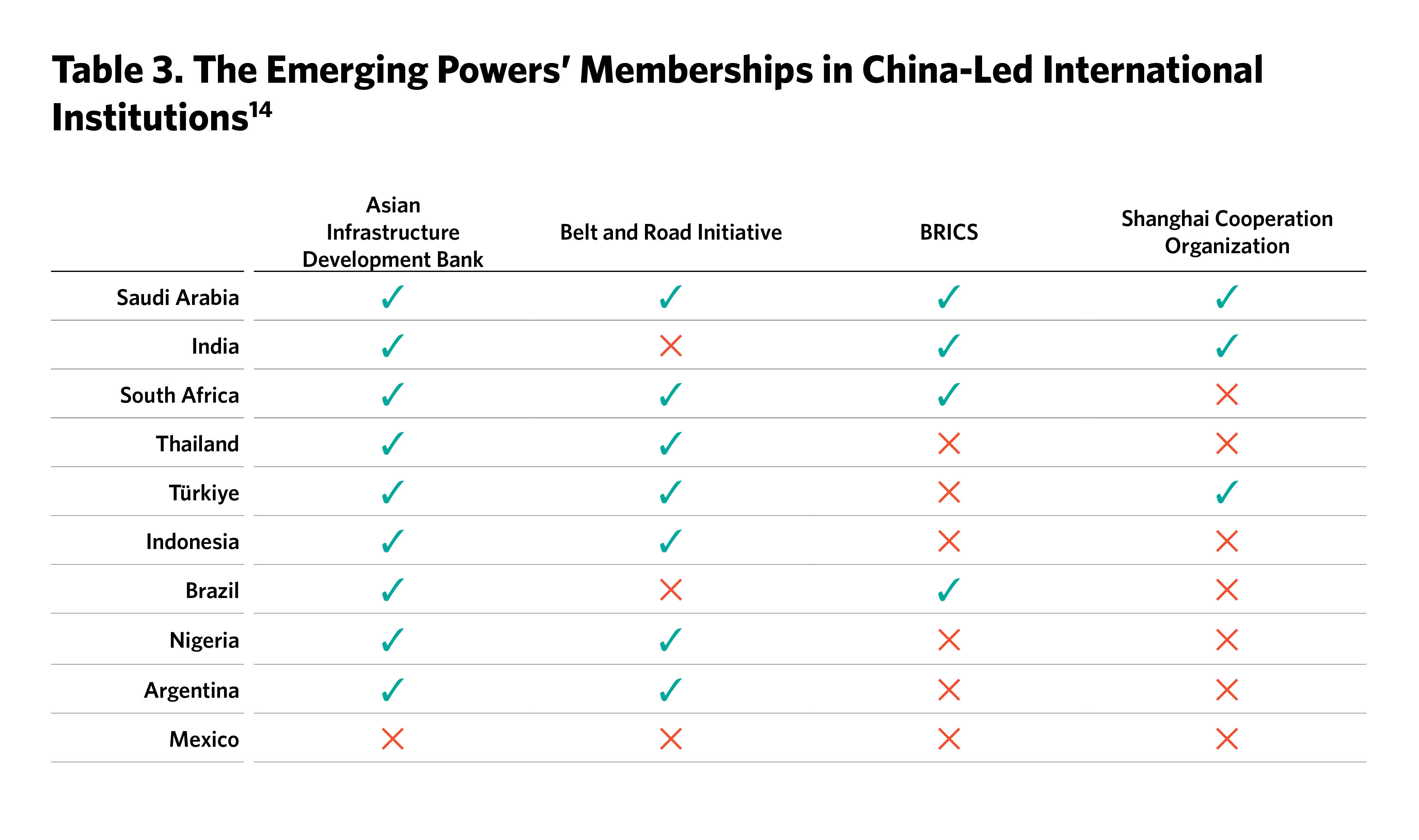 As this report details, the emerging powers are sure to resist efforts to bring them into a unified bloc with the United States against China and Russia. Overcoming this resistance would almost certainly require an outsized investment of U.S. diplomatic, economic, and military resources—more than is worthwhile. This approach could also lead the United States to turn a blind eye to human rights abuses, misuse its military and other resources, and overextend itself repeatedly, as during the Cold War. With this strategic framing, it could too easily be overly concerned with “losing” key emerging powers to China or Russia—the same logic that once led to the tragic U.S. entanglement in Vietnam. Concerns about domino effects are unwarranted in any case because even when the emerging powers are closer diplomatically, economically, and militarily to Beijing than would be ideal for Washington, they have no more interest in becoming vassals of China than they do in becoming vassals of the United States. More likely, China’s imperious tendencies could strengthen the forces of resistance among most of the emerging powers over time.